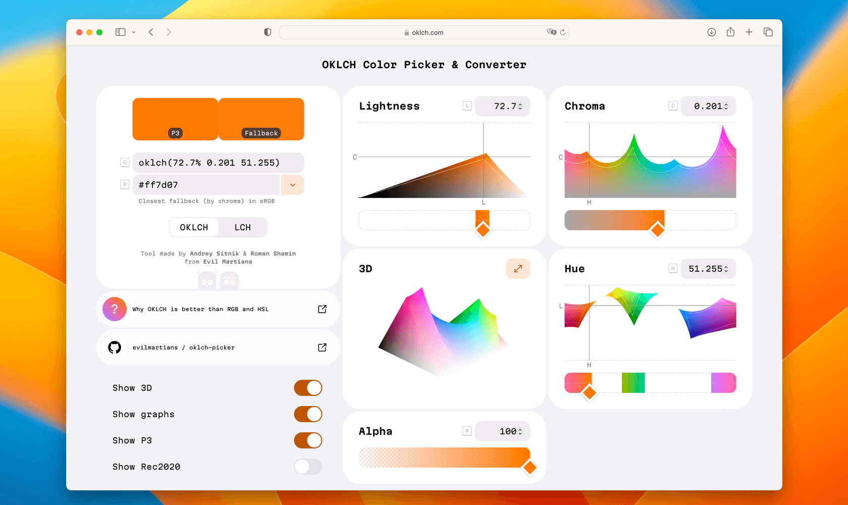 The first tool we’ll talk about is OKLCH.com, which is an interactive color tool designed by Evil Martians help to designers and developers explore, learn, and use the OKLCH color space.