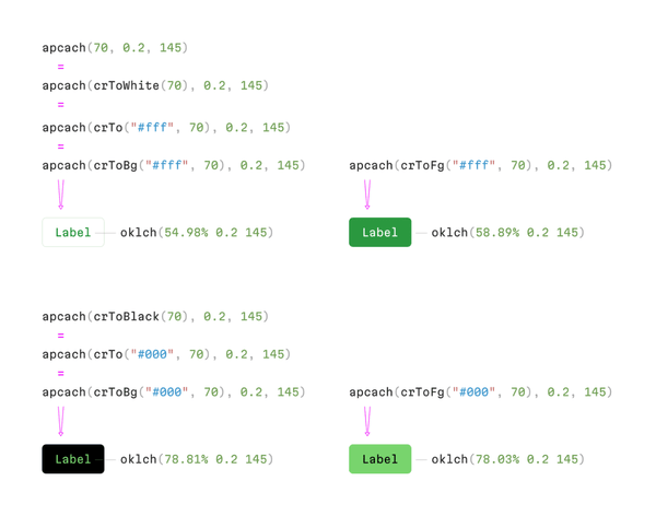 adjustContrast(color, 10); // oklch(54.98% 0.2 145)apcach color convertation to CSS